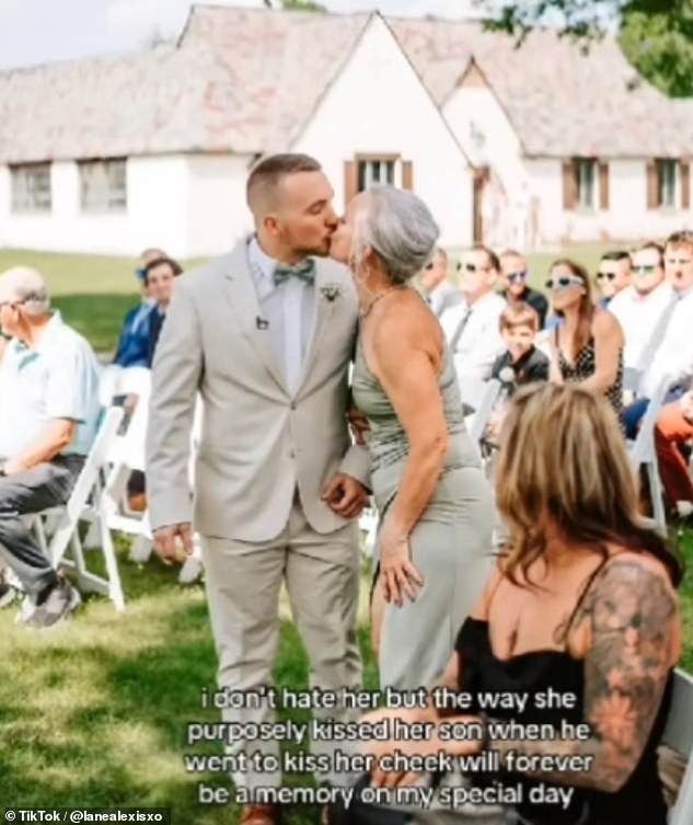 In one case, a woman donned a sheer white lace dress to enjoy a ‘creepy’ dance with her son, ‘latching’ onto him in an awkward hug in front of his bride