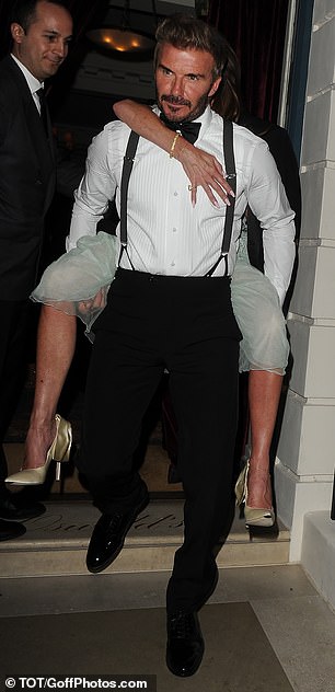 David Beckham was seen carrying wife Victoria on his back as they left her £250,000 50th birthday party in the early hours of Saturday morning