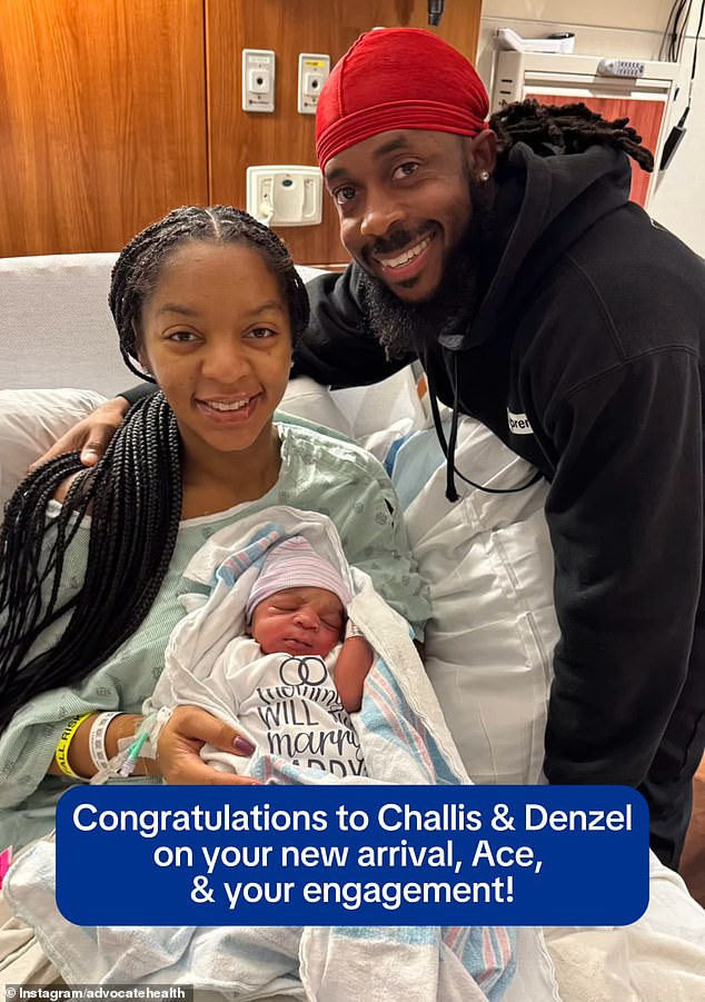 ‘Moments after the birth of her first son at Advocate Christ Medical Center, Challis received a joyful surprise – a marriage proposal, printed on her baby’s onesie,’ read the caption.