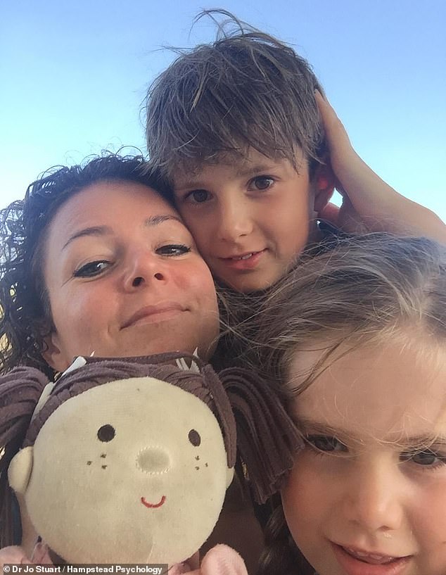 Family psychologist Dr Jo Stuart is pictured here with her two young children. She told the Daily Mail that modern employment requires parents to ‘function like machines’ and cautioned carers to implement rest periods or risk dire consequences to their mental health