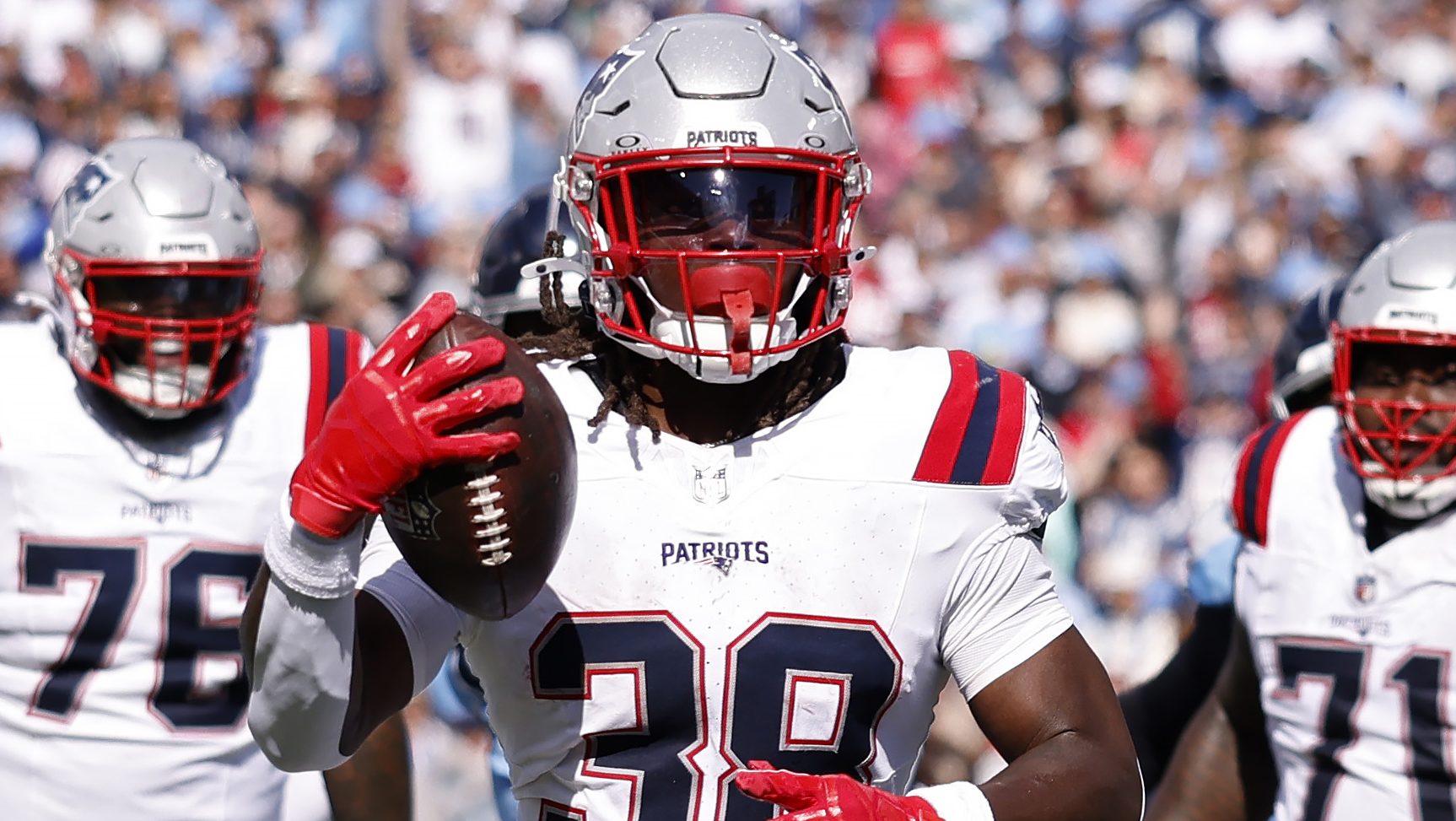Rhamondre Stevenson #38 of the New England Patriots rushes for a touchdown against the Tennessee Titans during the third quarter of the game at Nissan Stadium on October 19, 2025 in Nashville, Tennessee. (Photo by Johnnie Izquierdo/Getty Images)