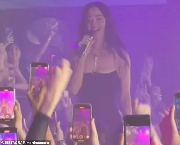 ‘Thank you,’ she added, before launching back into the track while kneeling down and offering the biscuits to audience members in the front row.