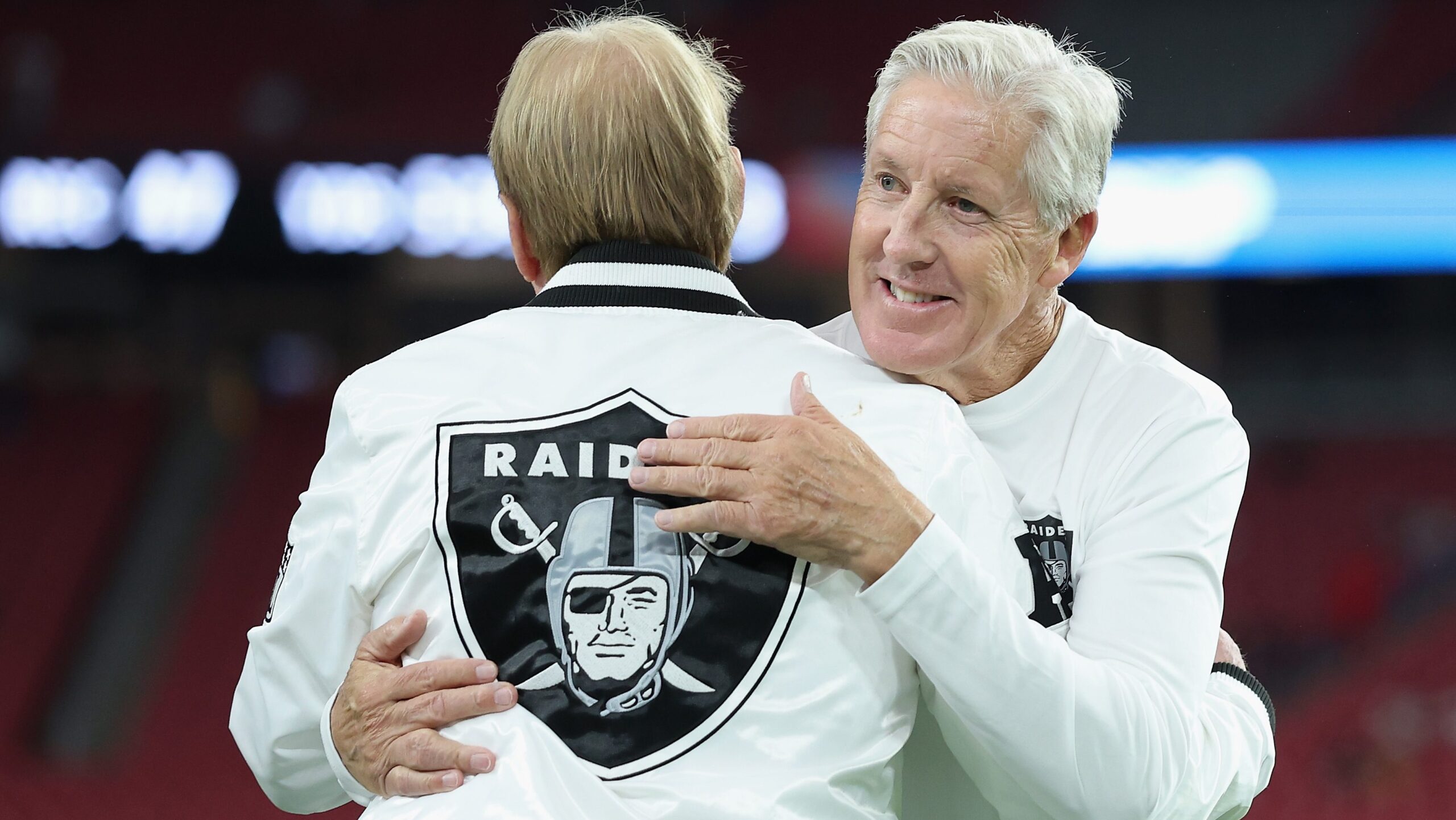 Pete Carroll greets Mark Davis before a preseason game against the Cardinals on August 23, 2025.