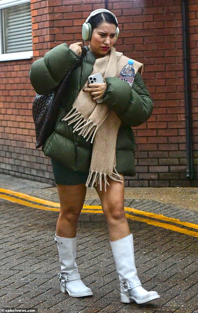 Arriving for a studio session in the capital she flashed her legs in a grey mini dress and over the top wore a khaki padded coat.
