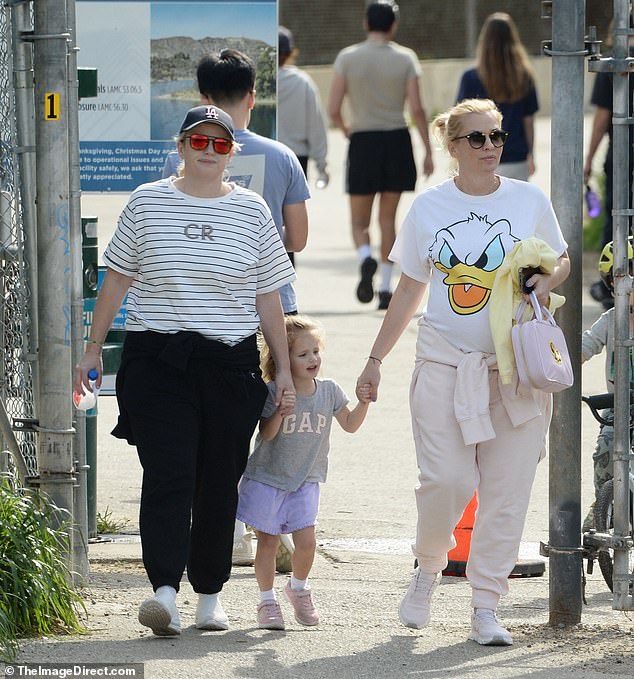 The wives held the hands of their toddler daughter, who was sporting a trendy shirt from the Gap