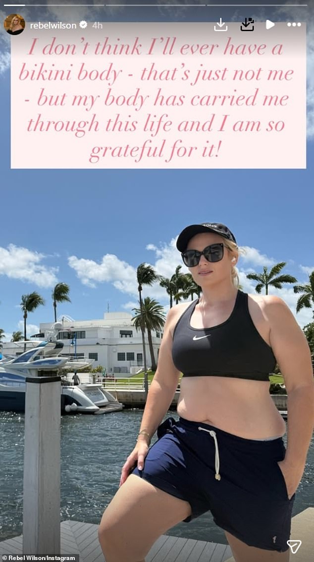 ‘I don’t think I’ll ever have a bikini body – that’s just not me – but my body has carried me through this life and I am so grateful for it,’ Rebel captioned the image.