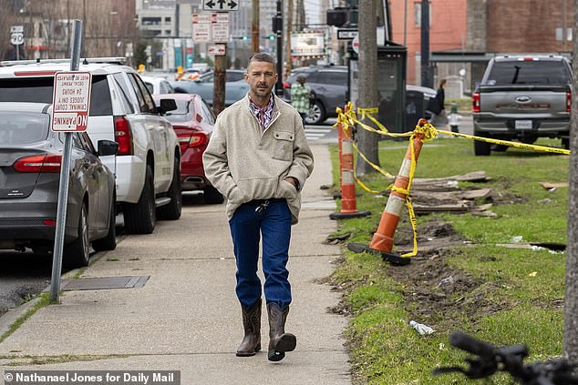 At one point, LaBeouf was seen checking his watch and pacing nearby before crossing the street, keeping his head down as he moved through the area.