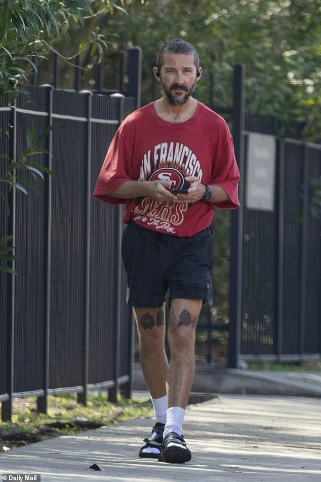 On Thursday, the former Disney Channel star, 39, emerged for a walk through a nearby park in an oversized, red San Francisco 49ers shirt and black shorts