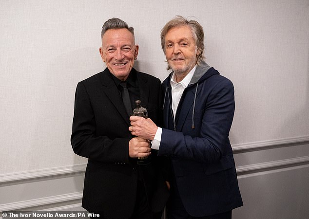 Bruce Springsteen appeared in high spirits on Thursday evening as he was presented the Academy Fellowship Award by pal Sir Paul McCartney at the star-studded Ivor Novello Awards