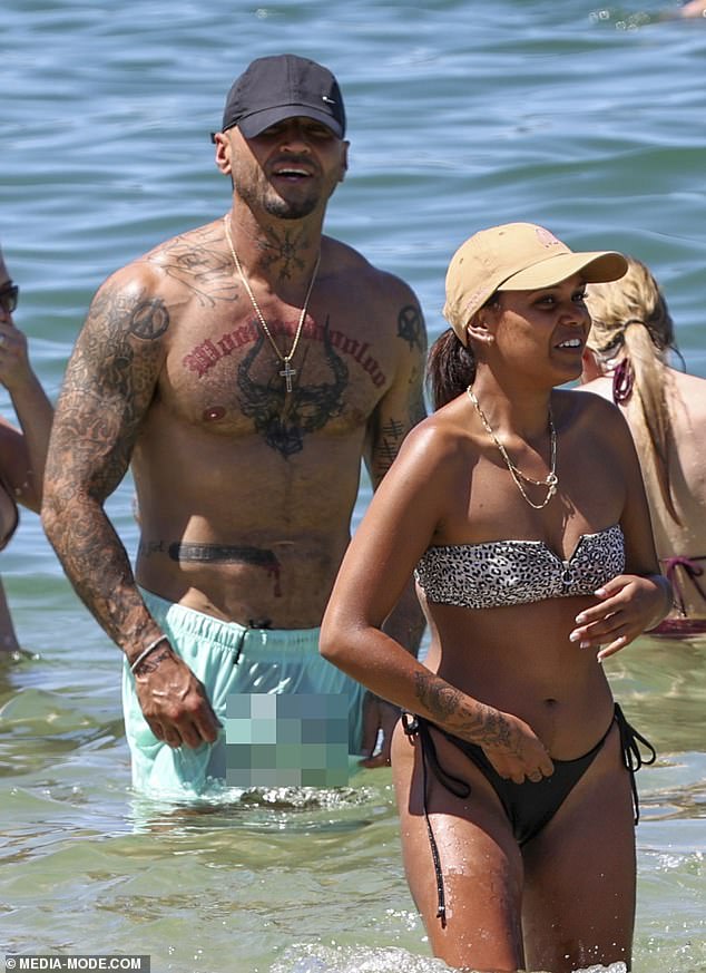 Spanian (left) accidentally gave onlookers an eyeful when his boardshorts turned see-through unexpectedly during a swim at Balmoral Beach with his girlfriend Ava Jean Walker (right)