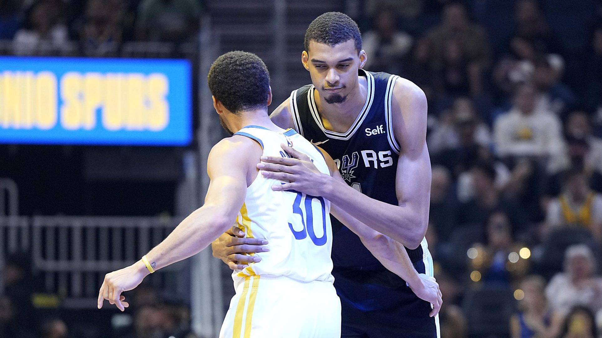 Victor Wembanyama of the San Antonio Spurs and Stephen Curry of the Golden State Warriors greet each other prior to the game.