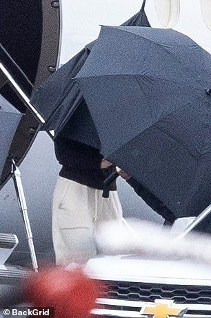 The 35-year-old billionaire was covered by male staff holding black umbrellas as she made her way into a waiting SUV