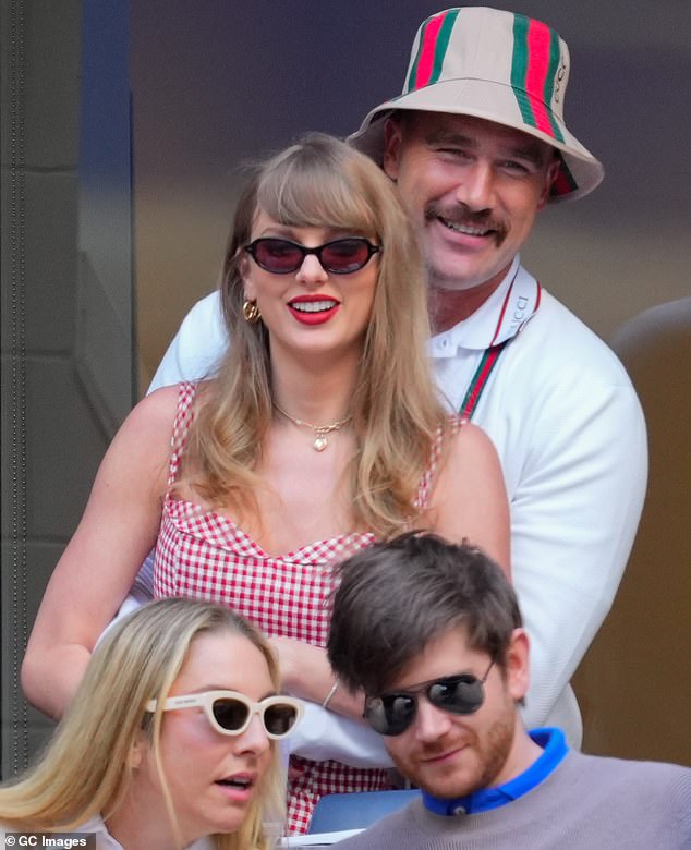 Taylor Swift’s fiancé Travis Kelce gave a sly nod to his ‘wood’ in a Valentine’s Day card posted to Instagram on the romantic date; pictured at the US Open in New York in 2024
