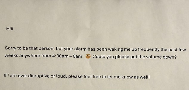The note itself was slipped under her door and read: ‘Sorry to be that person, but your alarm has been waking me up frequently the past few weeks anywhere from 4:30am – 6am. Could you please put the volume down?’