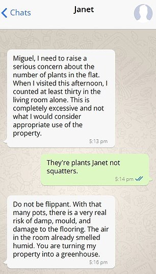 Property owner Janet sent renter Miguel an email raising a ‘serious concern’ about the number of houseplants he has scattered around every room.