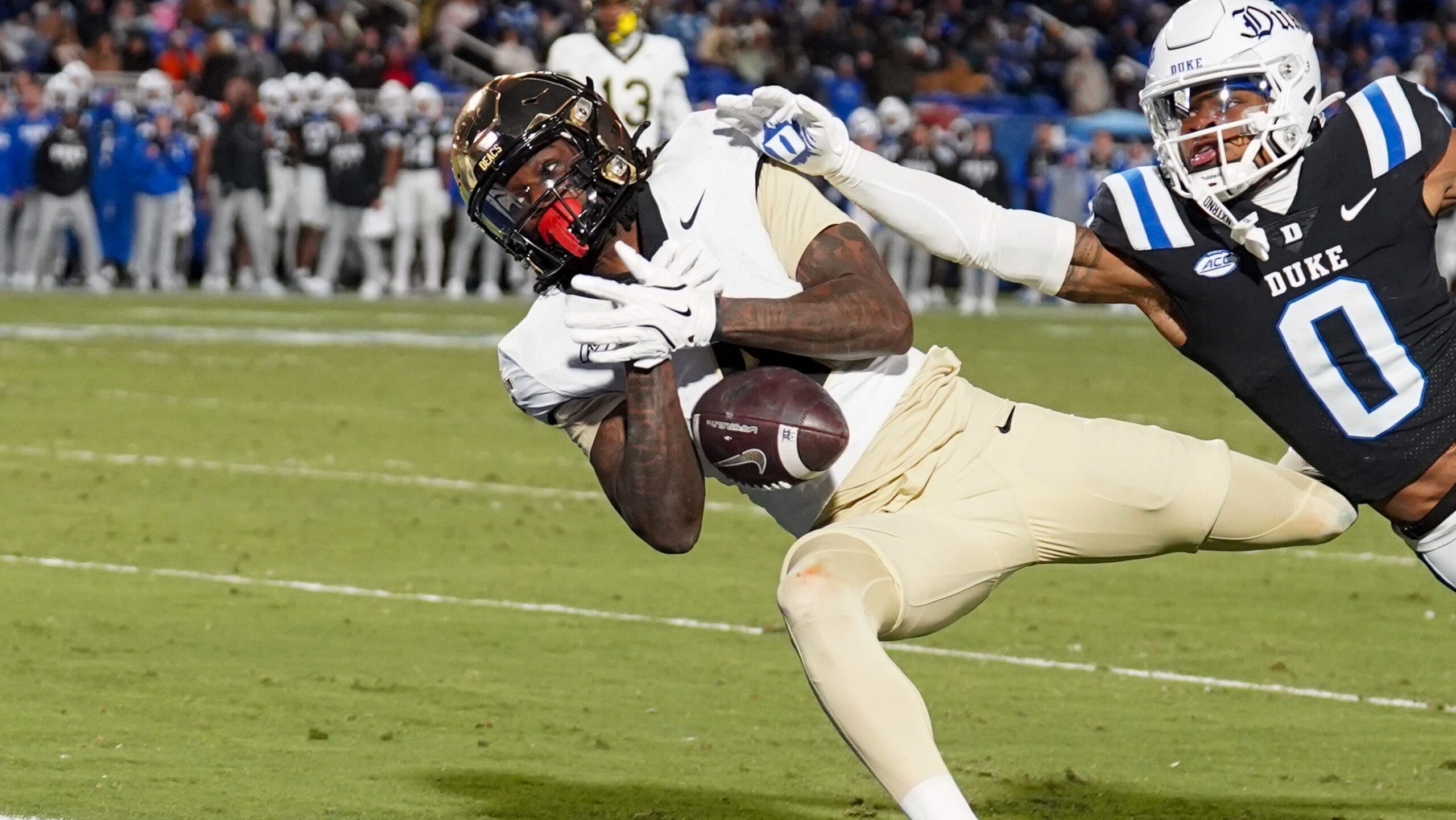 DURHAM, NORTH CAROLINA – NOVEMBER 29: Wide receiver Sterling Berkhalter #4 of the Wake Forest Demon Deacons drops a pass in the end zone during the second half of the game while being covered by cornerback Chandler Rivers #0 of the Duke Blue Devils at Wallace Wade Stadium on November 29, 2025 in Durham, North Carolina. (Photo by Alex Halloway/Getty Images)