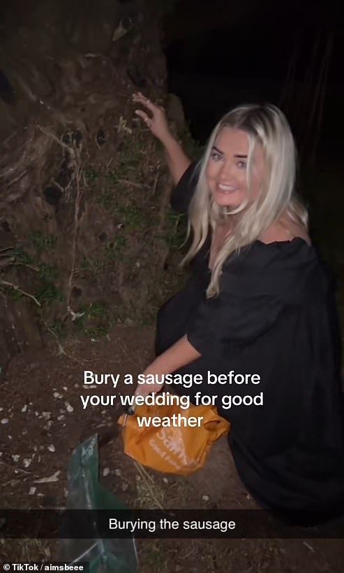‘This is your sign to bury a sausage the night before your wedding day,’ she said on TikTok. ‘Bury a sausage for good weather ladies, it actually worked.’