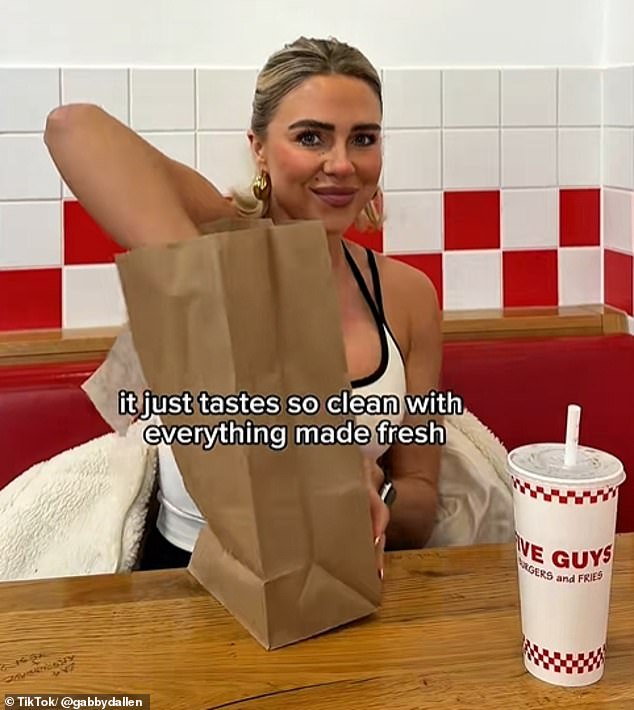 It was once the trendiest dining out option available – but now burger joints are slowly fading for Britain’s streets (pictured: Influencer Gabby Allen at Five Guys)