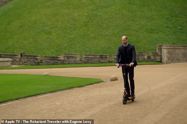 Joining Eugene Levy on the Apple+ TV series The Reluctant Traveler, Prince William , 43, revealed his preferred mode of transport for moving through the royal grounds – an electric scooter