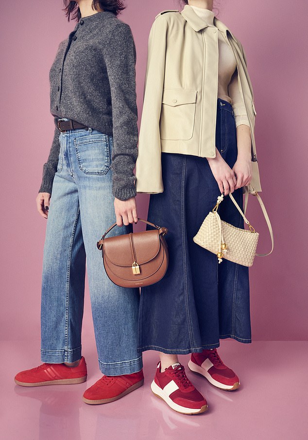 Left: Jumper, £17.60, matalan.co.uk; coat, £499, and jeans, £89, hobbs.com; trainers, £115, whistles.com; bag, £145, katespade.co.uk. Right: Shirt, £29.99, and jeans, £35.99, zara.com; trainers, £28, tuclothing.sainsburys.co.uk; bag, £329, radley.co.uk