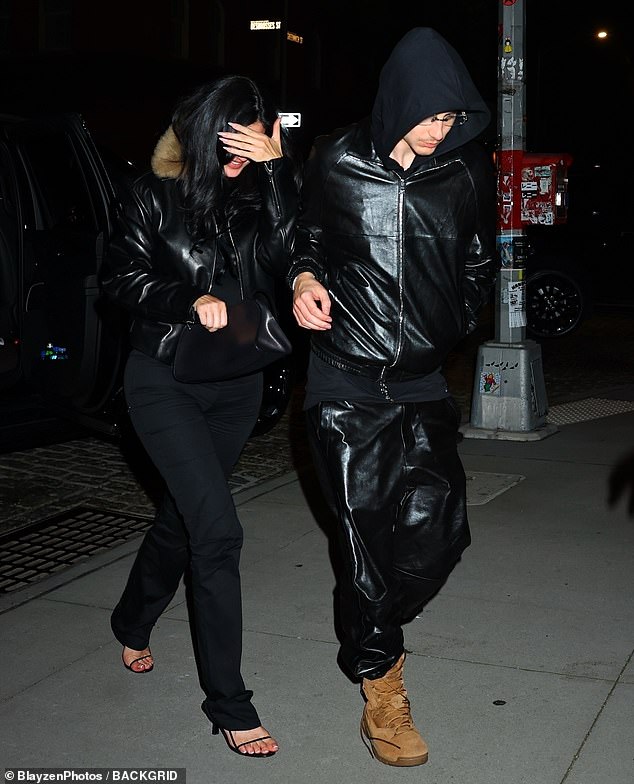The A-list couple were photographed in New York City on Monday evening wearing matching black leather looks, as Jenner covered her face with her hand