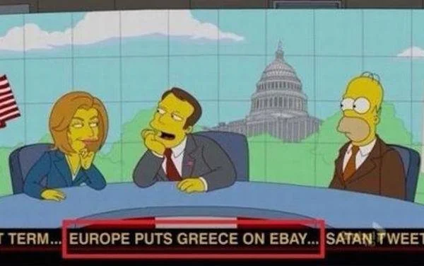 A 2012 episode shows a “Europe collapses” headline with Greece’s flag. Just a few years later, the country’s debt crisis made the gag unexpectedly topical.
