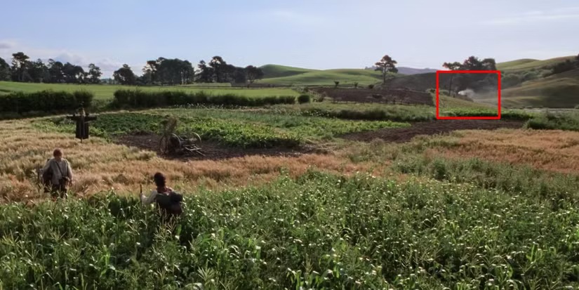 In an early Shire scene, a modern car is faintly visible in the far background. Middle-earth briefly intersected with contemporary traffic.