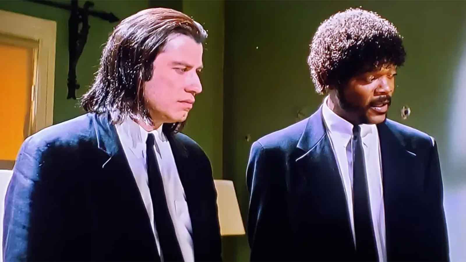 Right before Jules and Vincent are fired upon in the apartment scene, bullet holes are already visible in the wall behind them. The impacts appear before the shots are even fired, suggesting a continuity oversight during production.