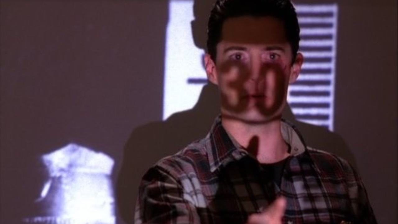 Yet, somehow, Keaton finds the most visually interesting ways of relating these story beats. She enters several scenes with a moody visual piece, usually consisting of slow motion and dissolves. The episode opens with the camera panning past shots of chess pieces, foregrounding Earle’s game against Cooper. She proceeds Windom Earle’s first scene with a slow-motion close-up of a saw blade cutting a log, mixed with slow-dissolves of gears, before finally settling the camera on actor Kenneth Walsh’s face. She arranges three levels of objects–a hand, the projector, a chess board–in between the camera and a screen for a sequence in which Albert tells Coop about Josie’s criminal past.