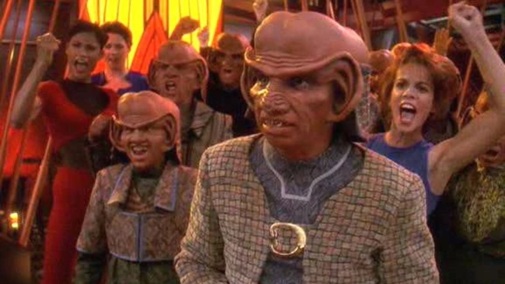 Like most Ferengi-focused episodes of Deep Space Nine, “Bar Association” has plenty of comedy to lighten the mood. And, to be sure, Quark’s unfair labor practices don’t fill the viewer with dread like the Jem’Hadar. But while few of us viewers will ever have to do battle with warriors pumped up on ketracel-white, most of us will have to stand up to those who would exploit us, making Rom’s rebellion one of the most immediately hopeful moments in the entire franchise.