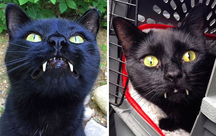 Meet Monkey, the black cat with vampire teeth who looks just like a character from a Halloween movie. He is a rescue cat who lives in NY State with his loving owner, and his teeth are for real. The kittie’s human Nicole Rienzie was in a car on her way home when her mother nearly hit a black kitten. When they got out of the car, they saw a cat that was malnourished, covered in bugs and dirt, and with an eye infection so big, he could barely see where he was going. “At first I tried to find him a home but I realized how much our meeting was divine alignment. I needed him just as much,” Rienze told LoveMeow. Soon after Renzie adopted the cute cat, his teeth started to grow, and she realized the cat was special…