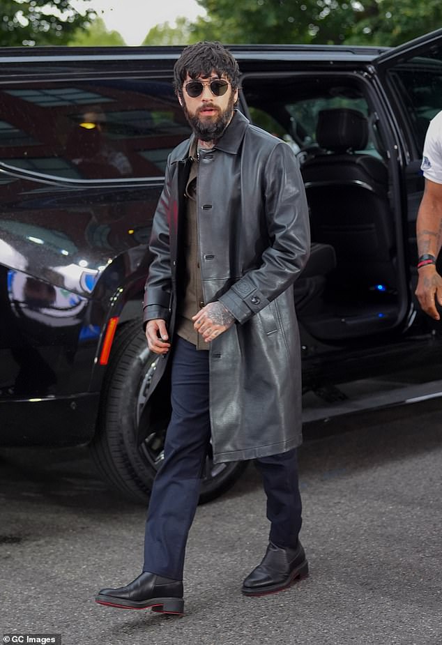 Upon arrival, Zayn wore a a long black leather jacket and navy blue trousers and completed the look with a pair of dark sunglasses.