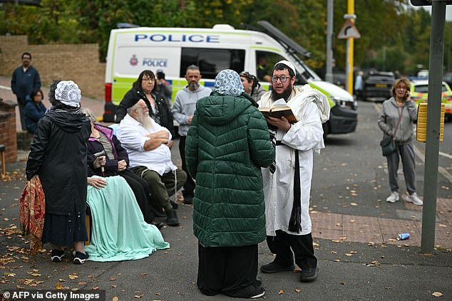 Members of the local Jewish community stand in the street outside Heaton Park synagogue following the terrorist attack