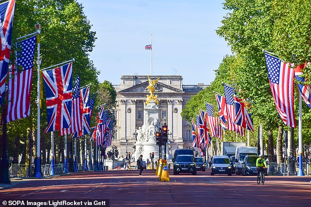 American flags and Union Jack flags decorate The Mall leading to Buckingham Palace ahead of the state visit by Donald Trump last month