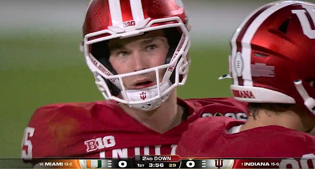 Indiana coach Curt Cignetti was furious with the officials as he walked off for half time, telling ESPN: ‘There are three personal fouls on the quarterback not called on one drive that need to be called because they’re obvious personal fouls.