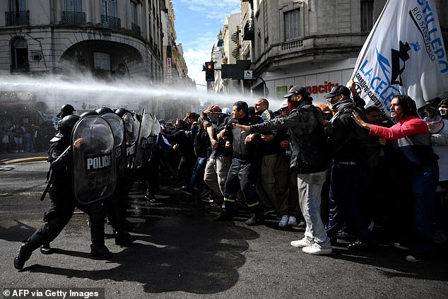Police use a water cannon to disperse demonstrators who tossed objects in Buenos Aires