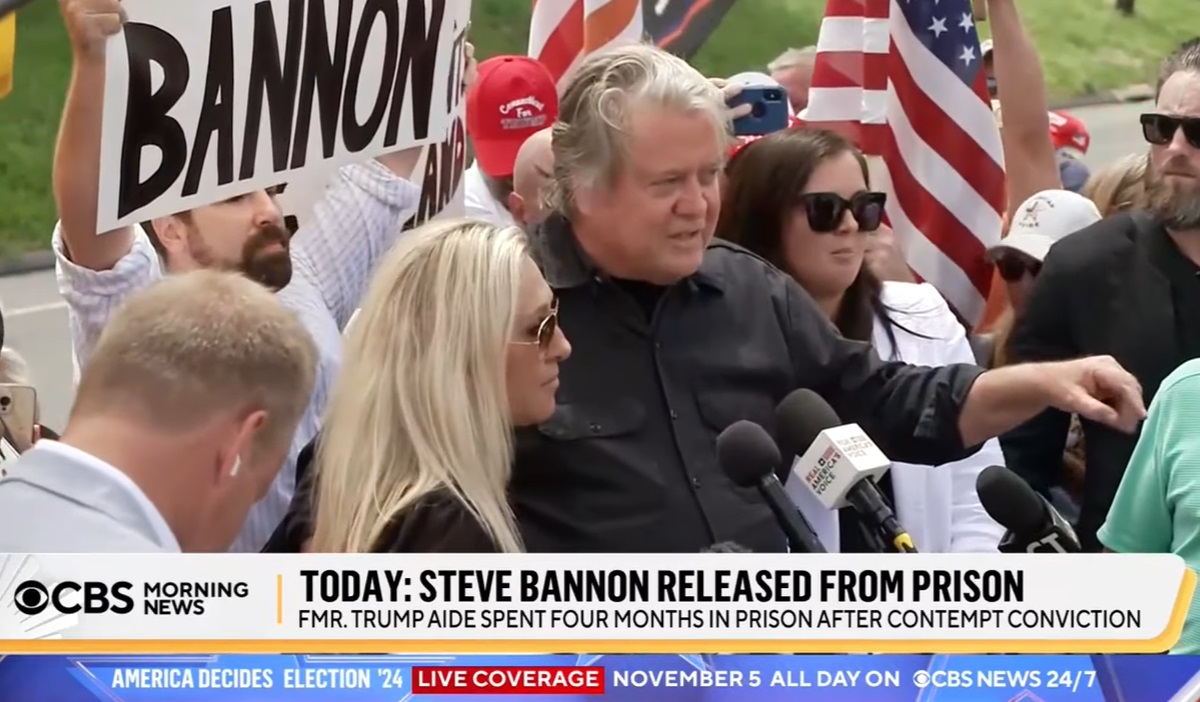 Conservative podcast host Steve Bannon warned Americans about Democrats’ efforts to rig the election immediately after his release from a federal prison on Tuesday.