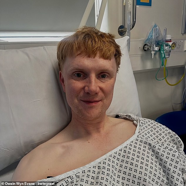 In his post, Owain shared a selfie of himself in his hospital gown in bed on the ward, and a second of him recuperating at home with his rescue cat Franny by his side.