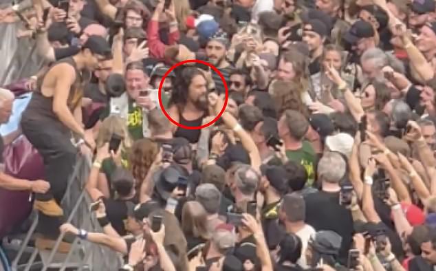 Footage of the incident finds Momoa, 45, removing his hair braid and climbing over the barricade to join raucous fans at the front of the stage.