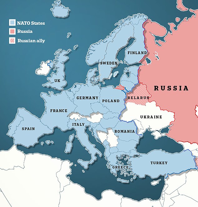 He said that Moscow’s ultimate aim was to push NATO back to its 1990s borders, ‘kick out’ the US from Europe and aggressively expand its influence.