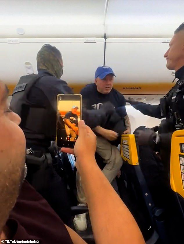 Dramatic video shows the moment British stag revellers were arrested on board a Spain-bound Ryanair flight after their rowdy behaviour forced the plane to divert to France.