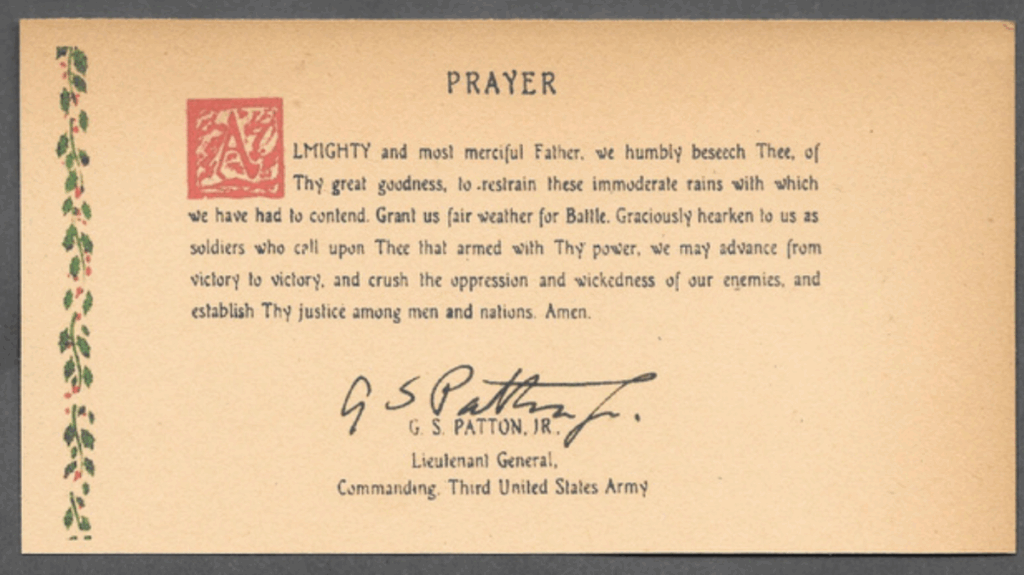 In 1944, General George Patton confronted constant rain that caused logistical problems for the troops. He asked Chaplain James O’Neill to pray and ask God to stop the rain. Patton had the prayer printed on 250,000 cards and distributed the prayer cards to all servicemen. The rain stopped in time.