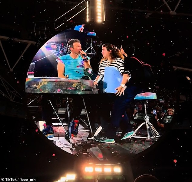 The singer, 48, brought two female Israelis on stage on Sunday evening after apparently catching sight of their sign which read ‘We Believe In Magic’ – a reference to the band’s hit song.