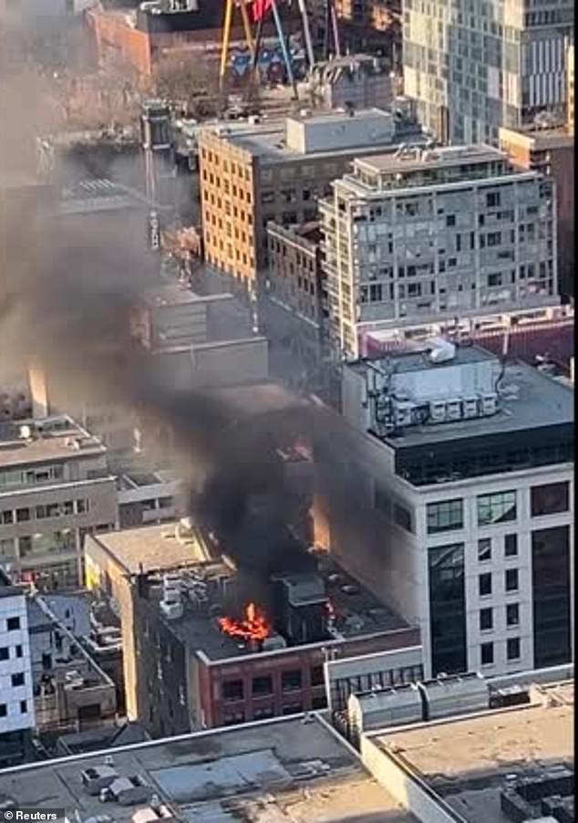 Images from above showed a raging inferno consuming the top of the building, with thick, dark smoke pouring into the evening sky, visible from blocks away.