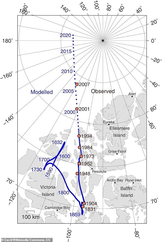For most of the past 600 years, the pole has been wandering around over northern Canada. It was moving relatively slowly, around six to nine miles per year, until around 1990, when its speed increased dramatically, up to 34 miles per year.