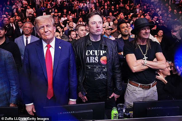 President-elect Donald Trump took Elon Musk to Madison Square Garden on Saturday for a UFC fight. They are seen here with Kid Rock (right)