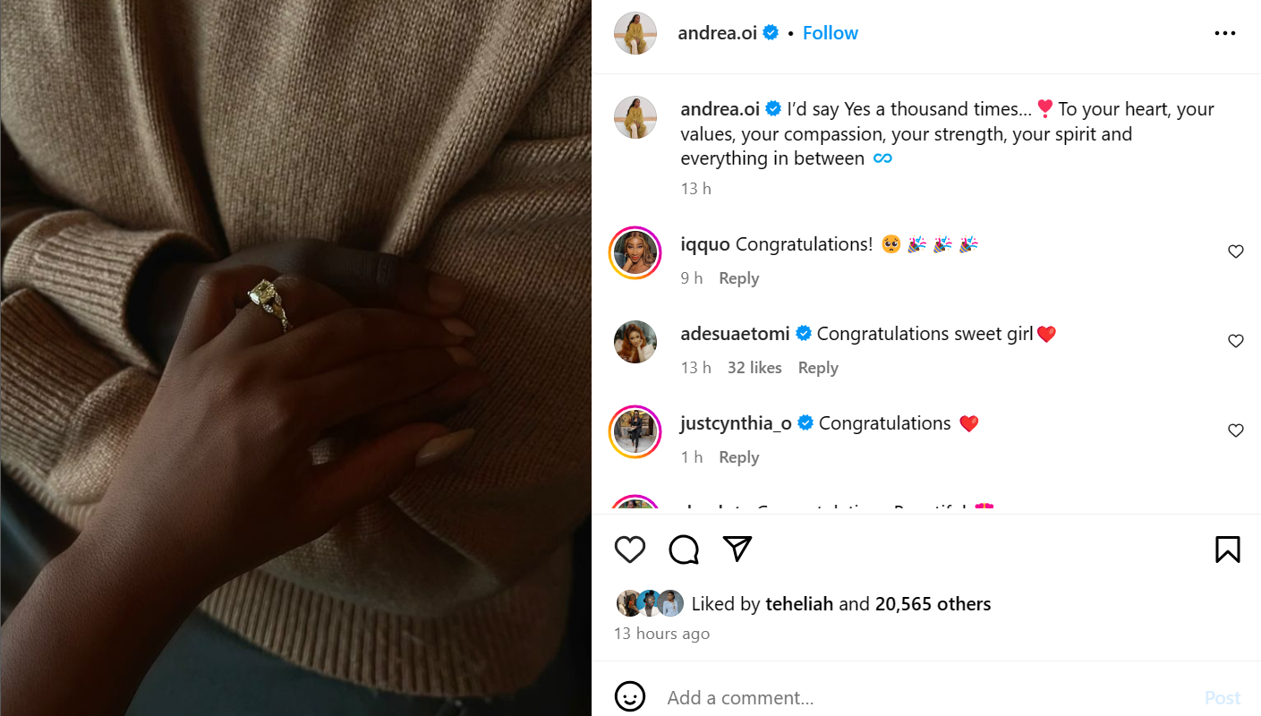 Showing off her engagement ring on Instagram, Andrea wrote “I’d say Yes a thousand times…..To your heart, your values, your compassion, your strength, your spirit and everything in between”