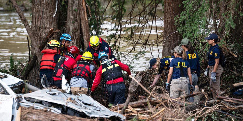 Pictured: Search and recovery workers dig through debris looking for any survivors or remains of people swept up in the flash flooding near Camp Mystic on July 6, 2025 in Hunt, Texas