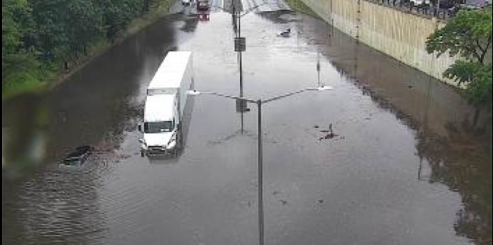 Photos and videos shared online showed cars along the Clearview Expressway in Queens, New York, submerged underwater as the rain started to fall.