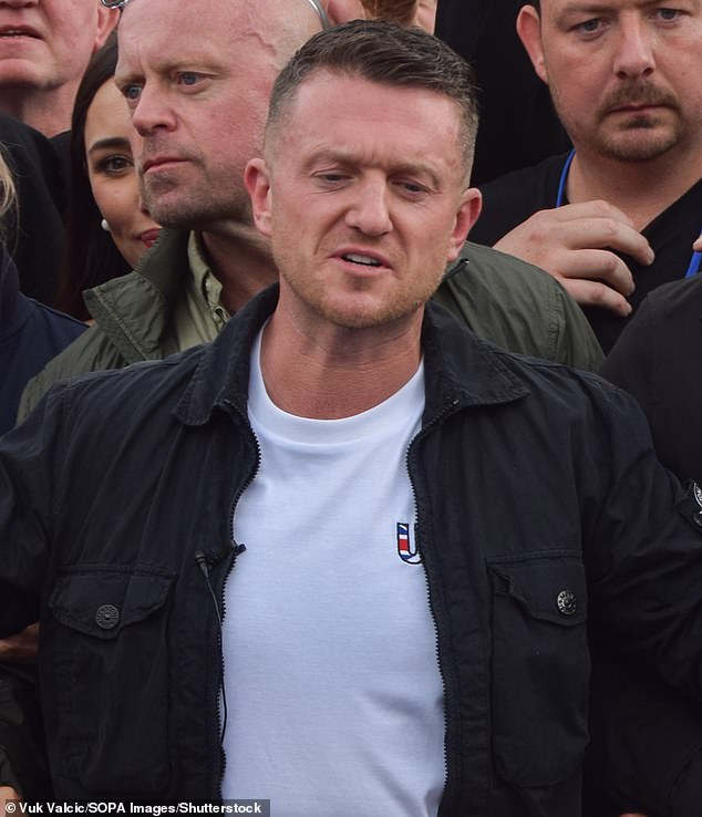 Robinson was wearing the a white UTK T-shirt while holding an anti-immigration banner alongside Laurence Fox and Katie Hopkins
